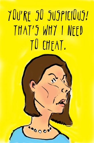 You may be surprised to learn that this bit of mindfuckery (your insecurity drove me to it) is not original. See the cartoon I used above (from Stupid Shit Cheaters Say). This one comes up a lot. And it’s patently moronic, so no wonder it’s pissing you off.