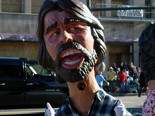 Mine would be a street balloon of Batman’s villain Twoface, held to the earth by balloon handler – chumps and their children trying desperately to hang on and steady the lines. Accompanied by the spangelly Pick Us Dancers, TM, there is no need for guidance to stay on the parade route, the wind blows the entire balloon and company wherever it wants to go.