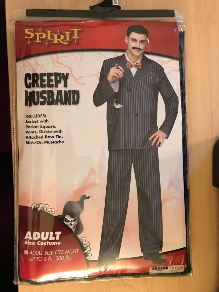 In reality, he looks like the costume of Creepy Husband. He’s quite tall. Otherwise, he could go out in street clothes as what he really is: a little nobody.