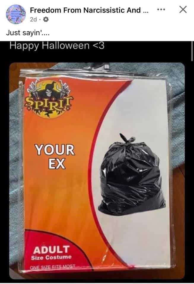 One of the last Halloweens I spent with my ex, she was mad that I didn’t want to go to the party with her friends who openyly use racial slurs and tell rape jokes (I was victimized as a child for many years and find them SO triggering). She dressed like a naughty nun and decided she needed to punish me by cheating on me for the probably multi hundredth time, this time with someone at the party. I heard stories of how desperately she was laying it on to every one of these attrocious racist friends until finally one bit. I think my costume this year is absolutely anything as I am just so so so glad she is long gone from my life and can no longer punish me by putting my health and safety at risk because I refuse to spend time with the flagrant bigots she holds close.