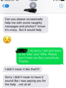 Then came the attached texts I have sent you. I was gobsmacked. He had the audicity to expect me to send him explicit photos and messages, in exchange for him sending me spousal support. (He claims he will send me some each week until I “remarry.” He’s claimed that all along, but this is the first time he’s sent any in over 6 months).