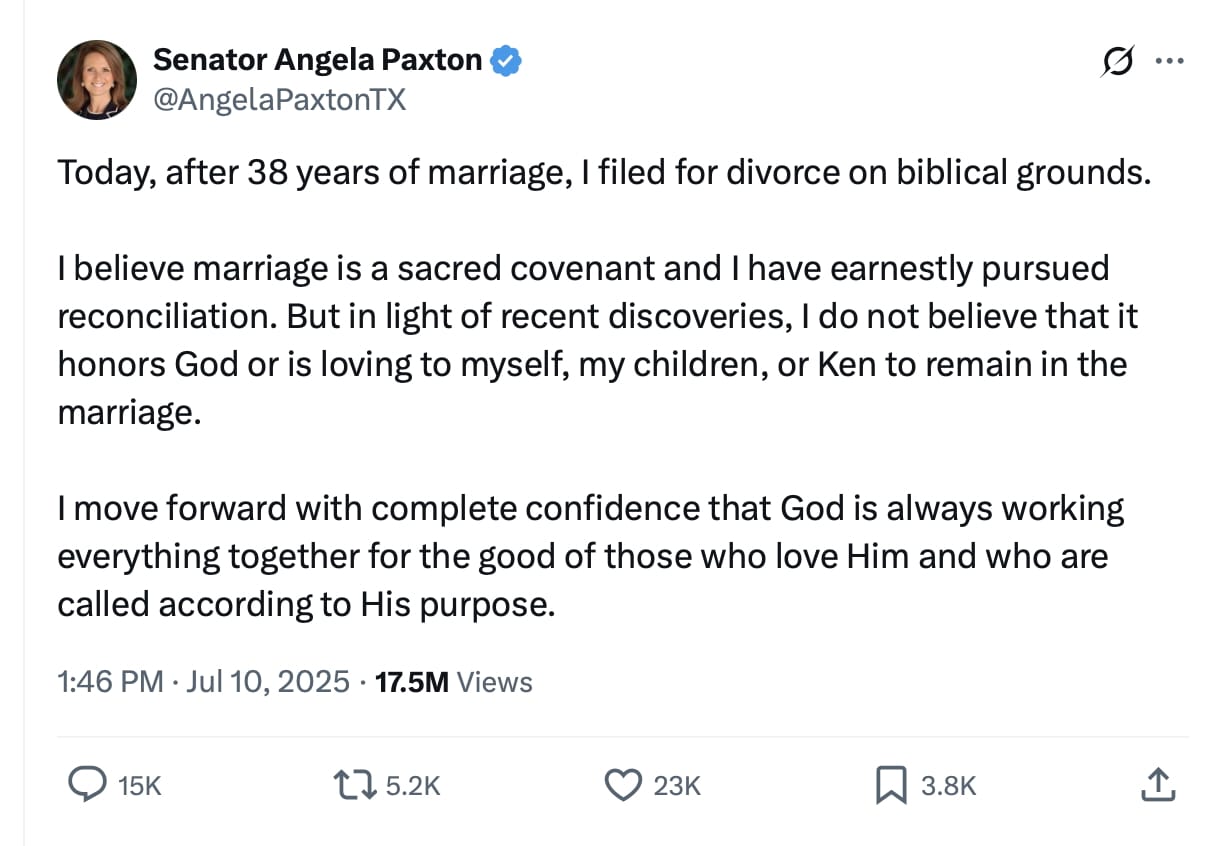 Angela Paxton filing for divorce will do more to rattle tradwife brains than any feminist essayist. One of their own says divorce is GOD-ORDAINED? And a woman with a 38-year marriage can refuse to stand by her man on the campaign trail? That if you love your children you won’t set a bad example leaving a fuckwit?