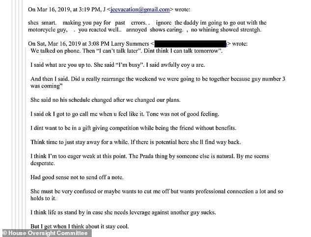 In one March 2019 email, Summers complained to Epstein that he was concerned that the attention he was giving one woman may not pay off in the form of sexual reward.