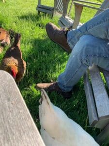 As for his country life — Mr. CL’s taken a shine to the chickens. And they to him (if chickens have feelings. I’m not sure. They may be purely mercenary.) Every evening he feeds them freeze-dried worms, and sometimes tortillas. They follow him around like little groupies. They even show up on our back stairs. (Which is awful, they poop. A LOT.)
