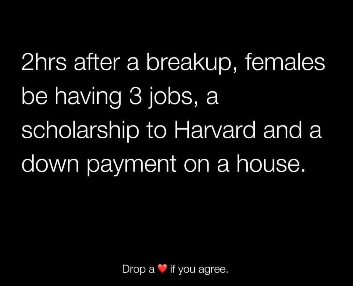 You might be stuck with a FW, lining up your ducks. Ducks count! Or you might be two weeks from the discovery of your partner’s double life and you’re eating solid food again. Points! Or you might be the three jobs and scholarship to Harvard meme above. Every new life effort matters.