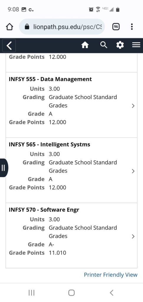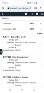 That first grader is in graduate school at Penn State studying data systems. He’s taking a full course load. Four classes — he got three As and an A-. A 3.9 GPA.