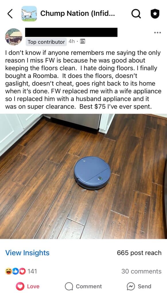What did you replace your cheater with? A woman trades her unfaithful husband in for a Roomba. And then outlines all the ways her new appliance is better than her ex.